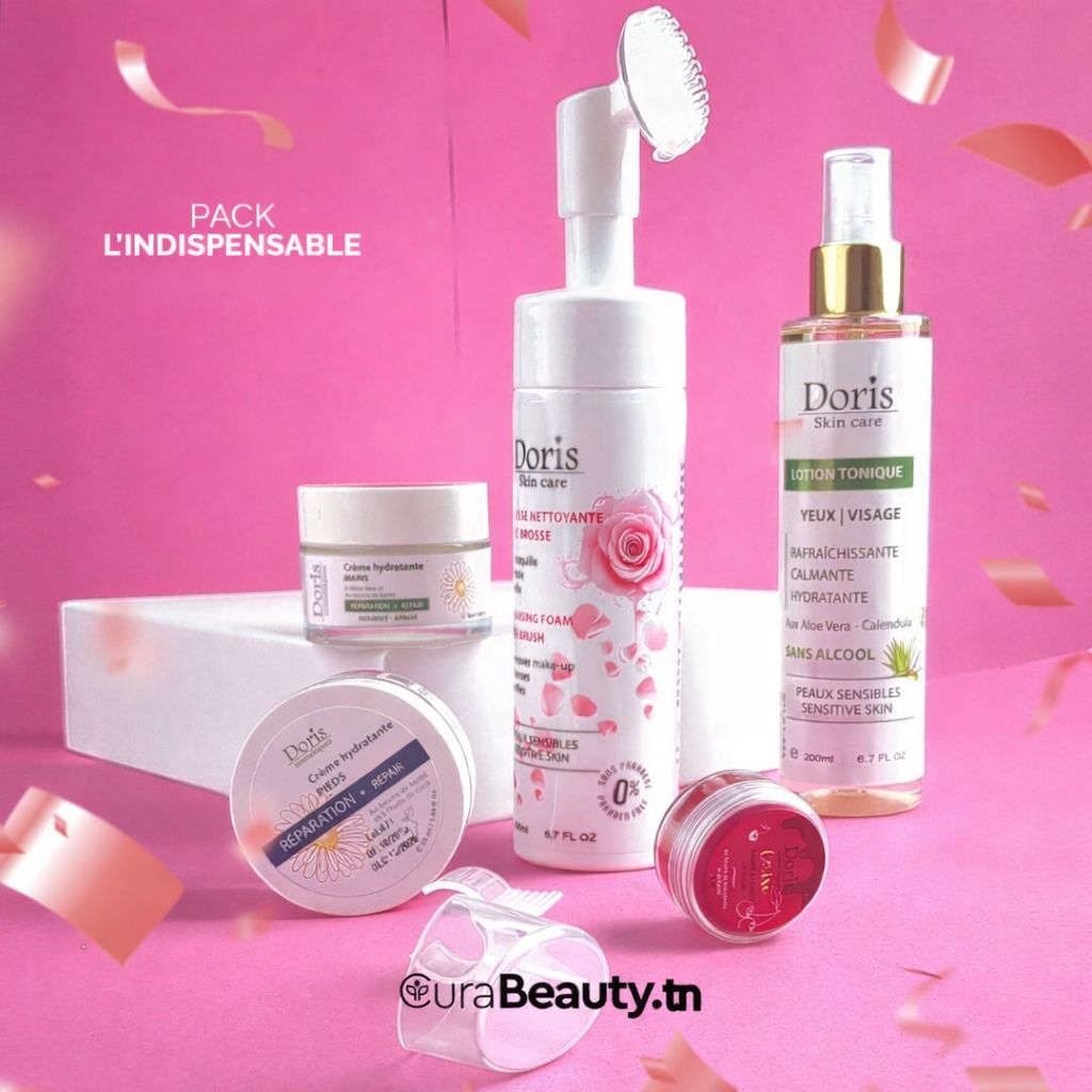 L’Indispensable Doris est le pack ultime pour une routine beauté globale. Il combine purification du visage, tonification et hydratation intense des lèvres, des mains et des pieds pour un résultat doux, net et durablement réparé.